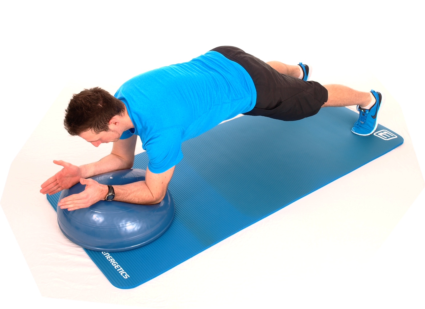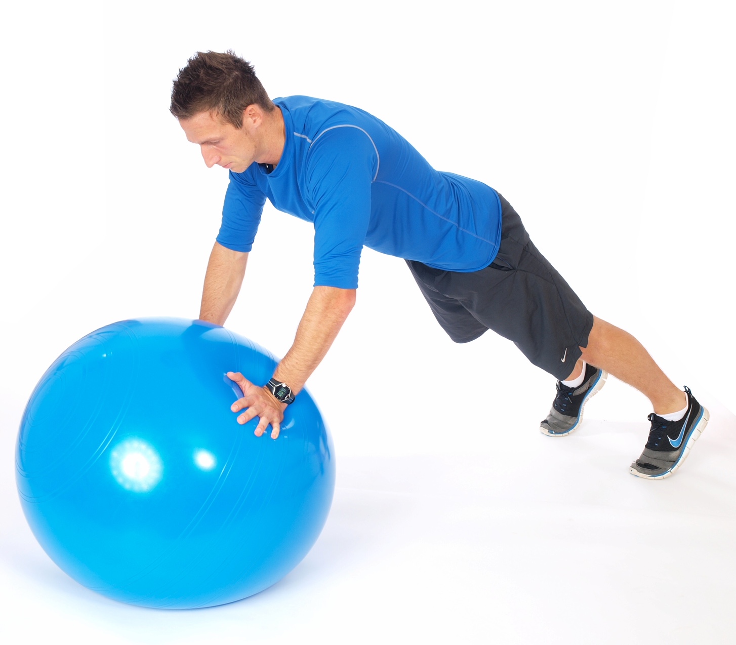 Beschreibung Liegestützposition mit den Händen auf zwei Medizinbällen Einen Arm nach vorne auf dem Ball abrollen und den anderen gleichzeitig beugen Position kurz halten, zurück