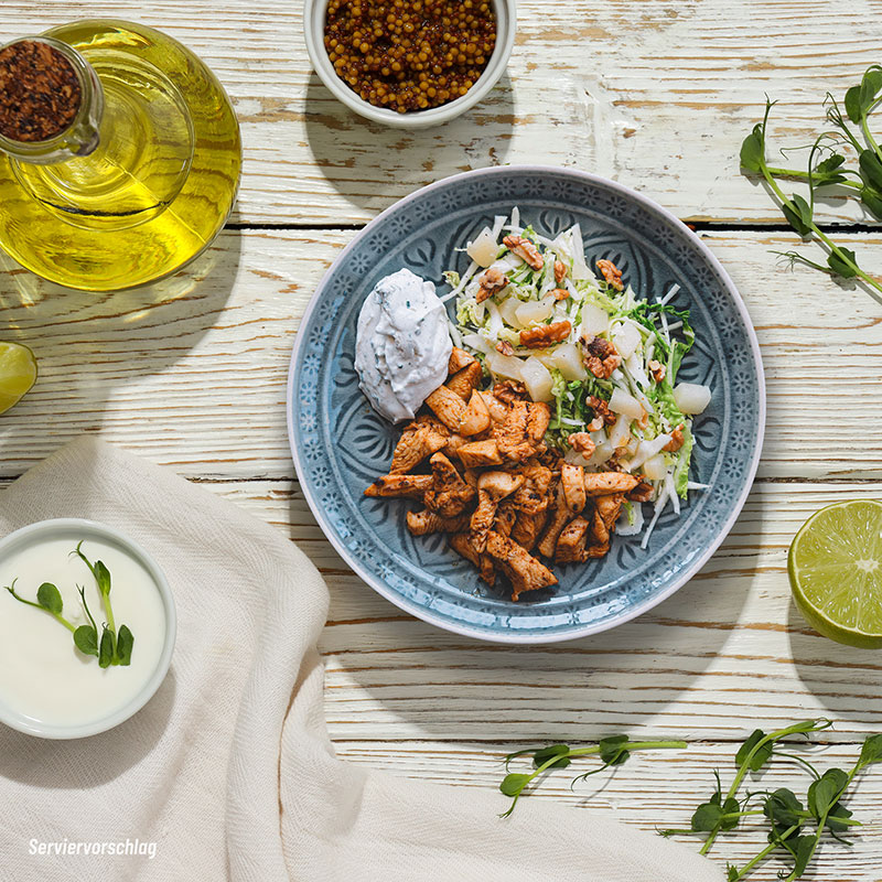 Hähnchengeschnetzeltes nach Gyros -Art mit Weißkohlwirsingsalat und Sour Cream