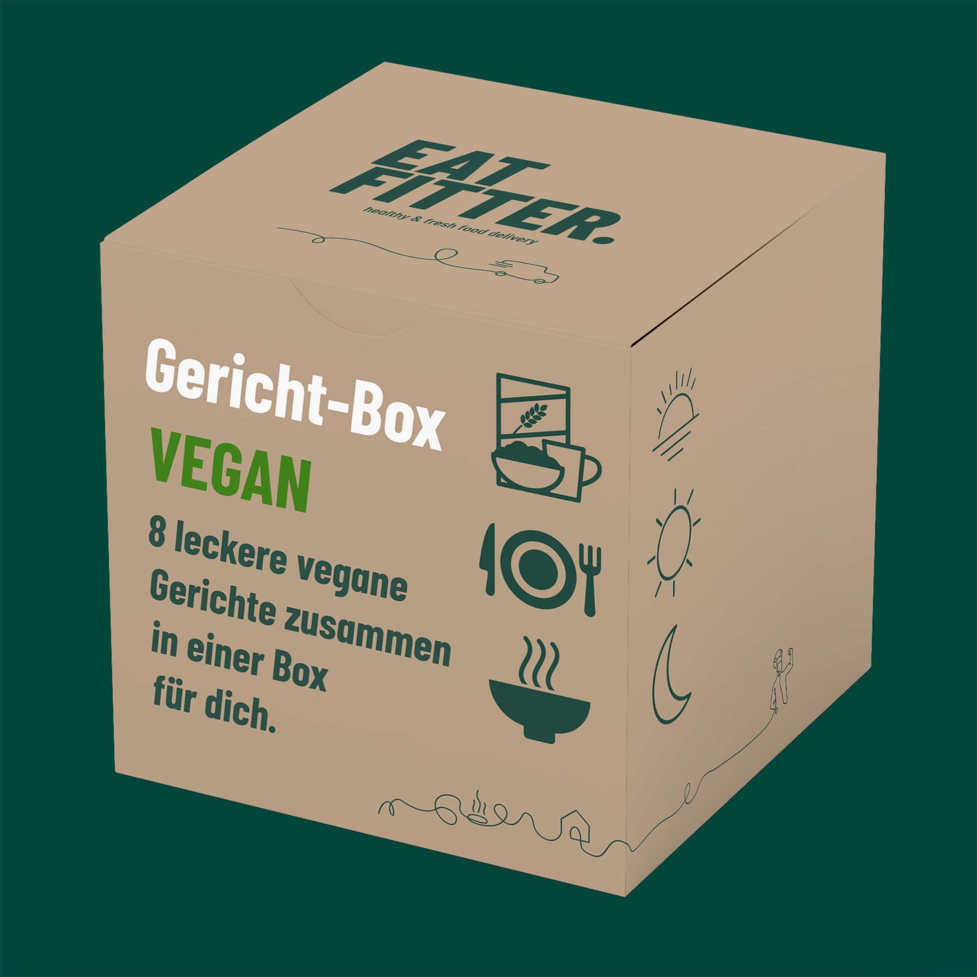 8 leckere vegane Gerichte zusammen in einer Box für dich.