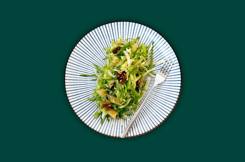 Weißkohlwirsingsalat mit Zuckerschoten und Walnüssen