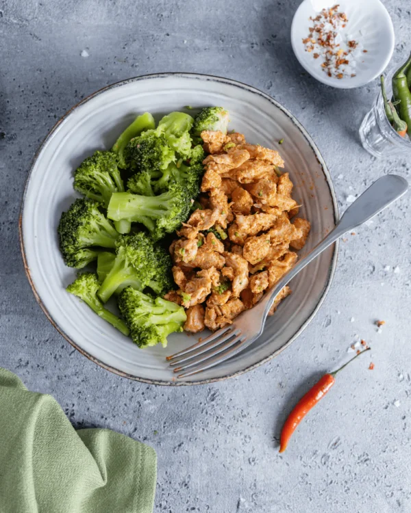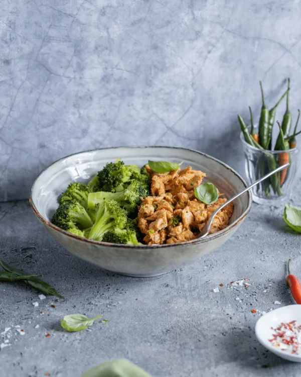 55% Broccoli, 42% Hähnchenbrustfilet, 1% Tomatenmark, Paprika Edelsüß,