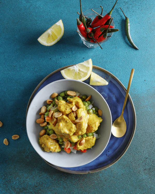 Hähnchencurry mit Erbsen und Blumenkohlreis