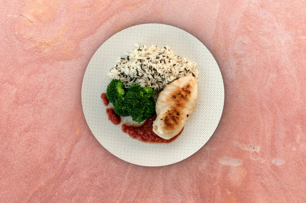 Hähnchenbrust mit Wildreis, Brokkoli und scharfer Tomatensoße