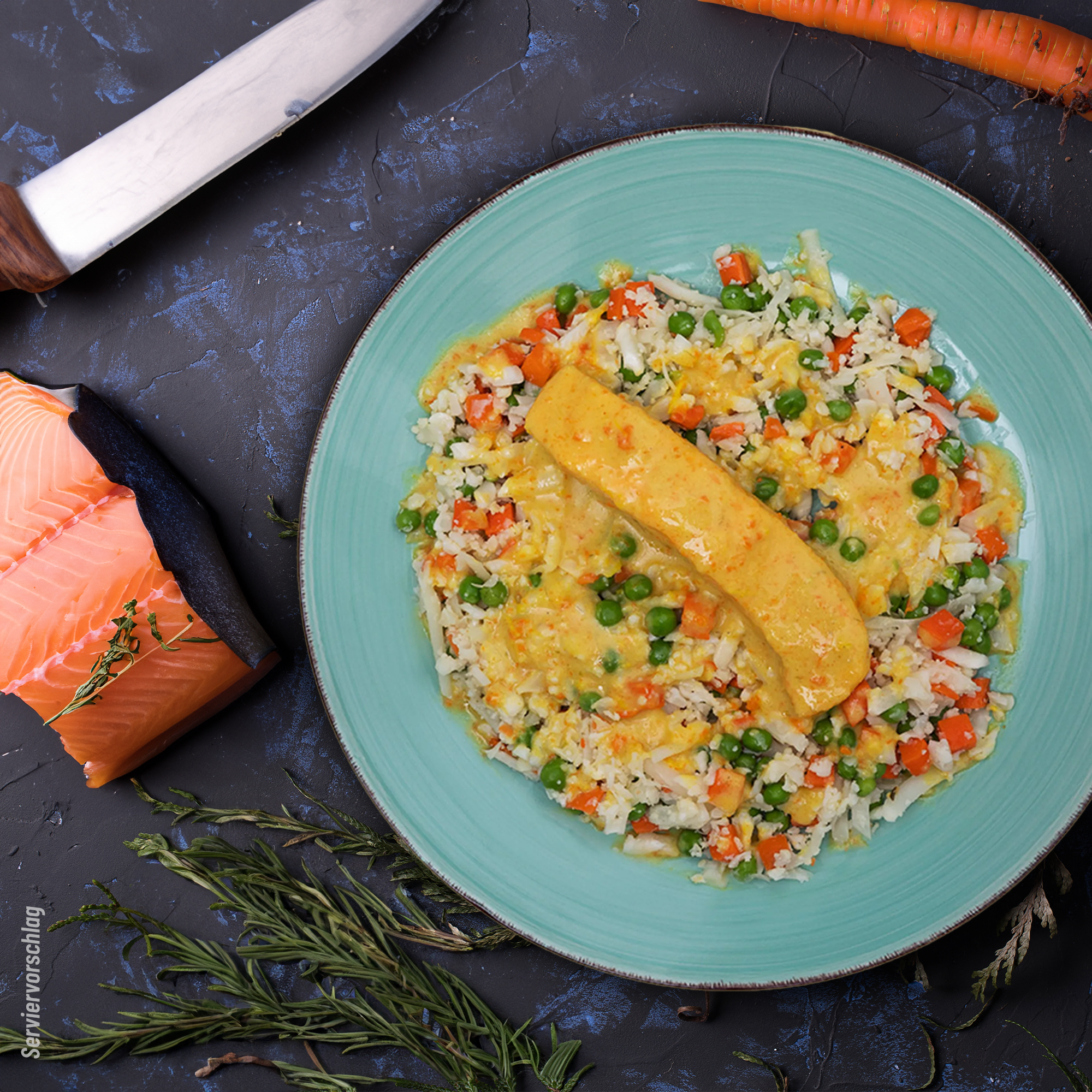 Unser Lachs mit Blumenkohlreis und gelber Currysauce ist ein geschmackvolles und gesundes Gericht, das aus frischen Zutaten zubereitet wird.