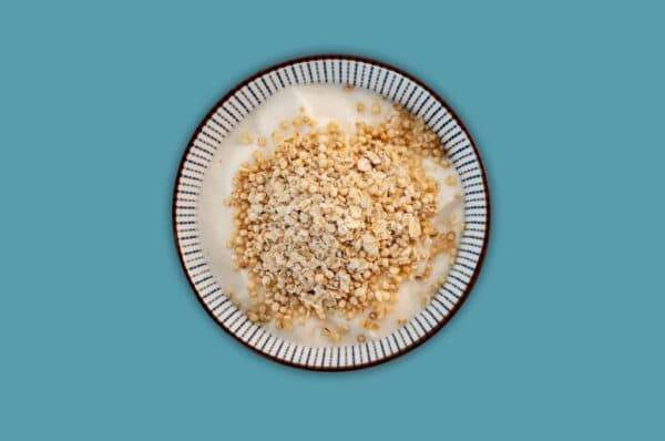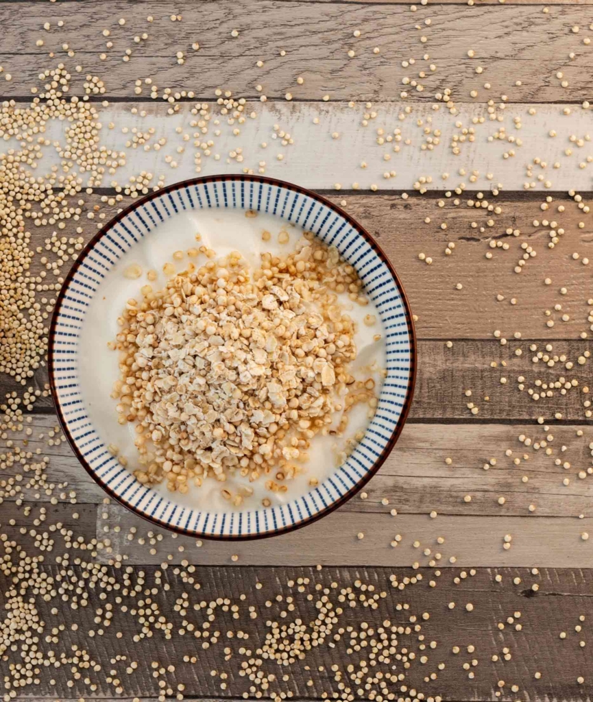 Joghurt und Magerquark gemischt mit Quinoa und Haferflocken. Verfeinert mit einem Schuß Rapsöl und Süßstoff. Als Frühstück oder als Zwischenmahlzeit.