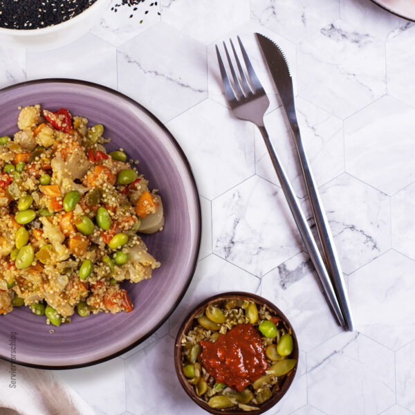 Ein einzigartiger Salat im South American Style. Vegan und proteinhaltig durch die Verwendung von Quinoa und Sojabohnen. Süßkartoffeln und rohe Blumenkohl runden den Geschmack ab.