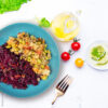 Red Power meets Power of Nature. Reichhaltiger, veganer und sehr geschmackvoller Salat voller Vitamine und Antioxidanten. Eine perfekte Kombination aus Cranberries, Rotkraut, Rote Beete, Quinoa, Öl und Zitrone. Mit Walnüssen verfeinert und die Birnen sorgen für ein fruchtiges Aroma.Dazu unser einzigartiger Salat im South American Style. Vegan und proteinhaltig durch die Verwendung von Quinoa und Sojabohnen. Süßkartoffeln und rohe Blumenkohl runden den Geschmack ab.