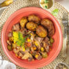 Kartoffeln 33%, Rindfleisch 25%, Champignons, Paprika, Gewürzgurken (Gurken, Branntweinessig, Zucker, Salz, Zwiebeln, SENFkörner, Gewürzextrakt (enthält SENF), Dill, Pfefferkörner, Koriander) 7,5%, Zwiebeln, Zuckermais, Essig, Salz, Olivenöl, Pfeffer, Origanum, Petersilie, Basilikum, Rosmarin, Thymian, Salbei, Nelken