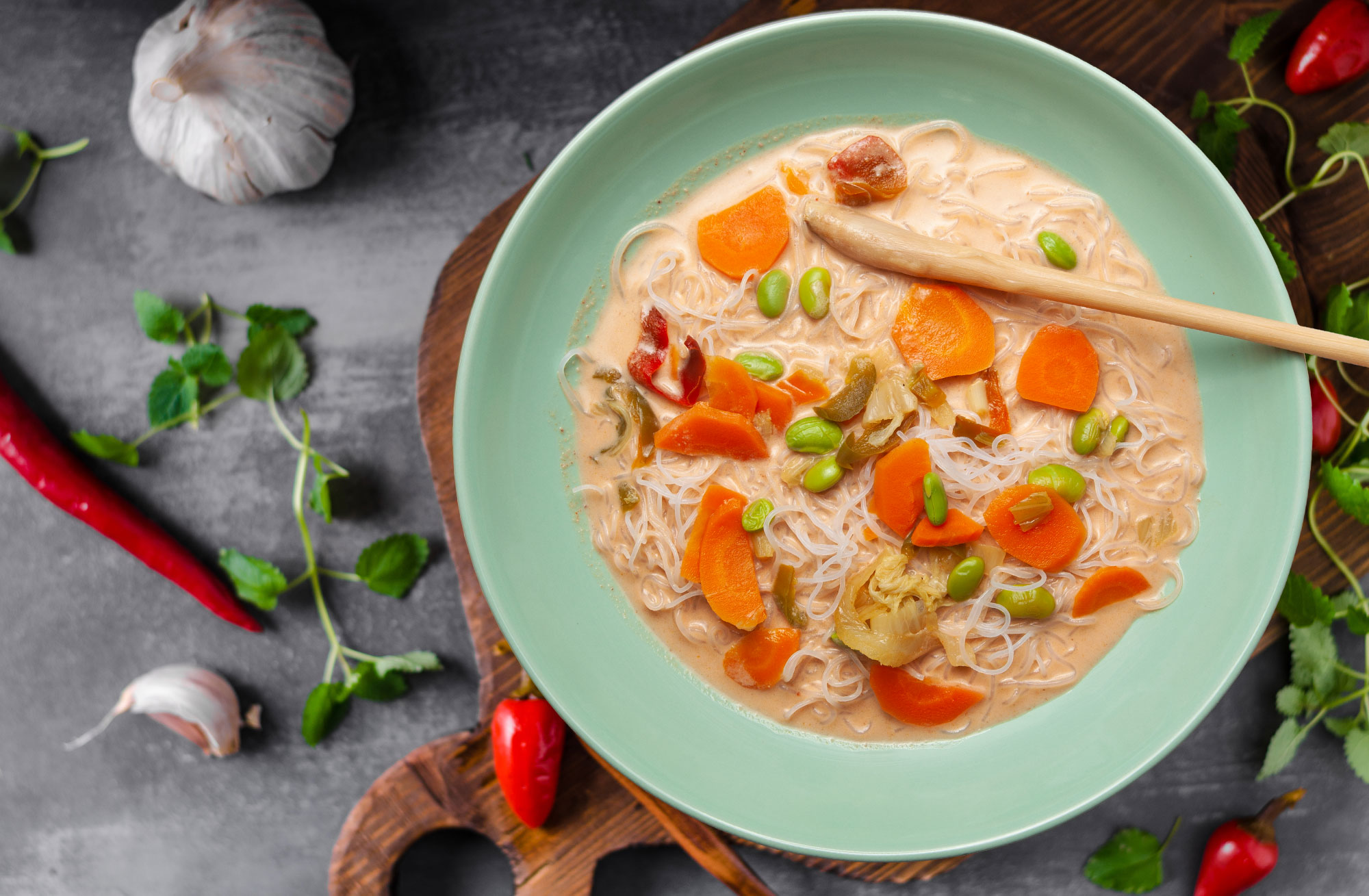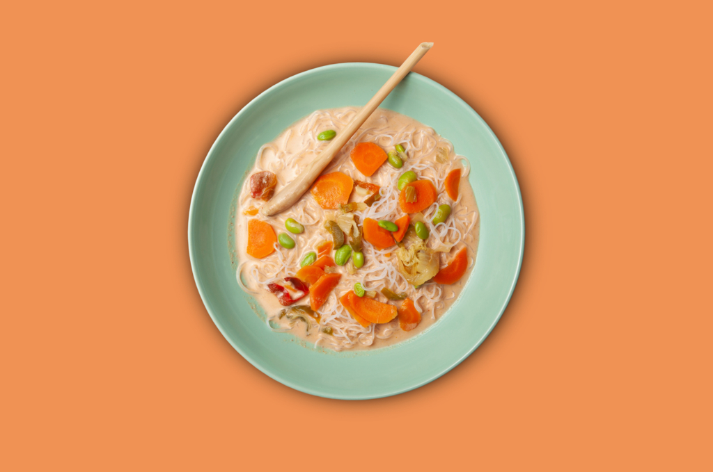 Dieses Gericht ist asiatisch inspiriert, bestehend aus Kokosnussmilch, Trinkwasser, Karotten, Chinakohl, Paprikaschote, Fenchel, Soja und Erdnuss. Die Paprikaschote und Chinakohl sorgen für eine knackige Textur und die Karotten und Fenchel sorgen für eine süßliche Note. Zwiebeln und Ingwer sorgen für Aromen und die Gewürze, wie Senf und rote Chilischoten, geben der Suppe eine würzige Note. Die Sojabohnen und Erdnüsse sorgen für zusätzliches Protein und der Löwenanteil, die Nudeln, sorgen für eine gute Sättigung.